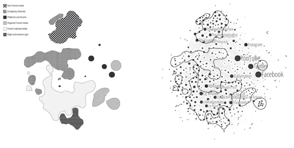 Networks are classic but under-acknowledged figures of journalistic storytelling. Who is connected to whom and by which means? Which organizations receive support from which others? What resources or information circulate through which channels and which intermediaries enable and regulate their flows? These are all customary stories and lines of inquiry in journalism and they all have to do with networks. Additionally, the recent spread of digital media has increasingly confronted journalists with information coming not only in the traditional form of statistic tables, but also of relational databases. Yet, journalists have so far made little use of the analytical resources offered by networks. To address this problem in this chapter we examine how “visual network exploration” may be brought to bear in the context of data journalism in order to explore, narrate and make sense of large and complex relational datasets. We borrow the more familiar vocabulary of geographical maps to show how key graphical variables such as position, size and hue can be used to interpret and characterise graph structures and properties. We illustrate this technique by taking as a starting point a recent example from journalism, namely a catalogue of French information sources compiled by Le Monde’s The Decodex. We establish that good visual exploration of networks is an iterative process where practices to demarcate categories and territories are entangled and mutually constitutive. To enrich investigation we suggest ways in which the insights of the visual exploration of networks can be supplemented with simple calculations and statistics of distributions of nodes and links across the network. We conclude with reflection on the knowledge-making capacities of this technique and how these compare to the insights and instruments that journalists have used in the Decodex project – suggesting that visual network exploration is a fertile area for further exploration and collaborations between data journalists and digital researchers.